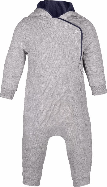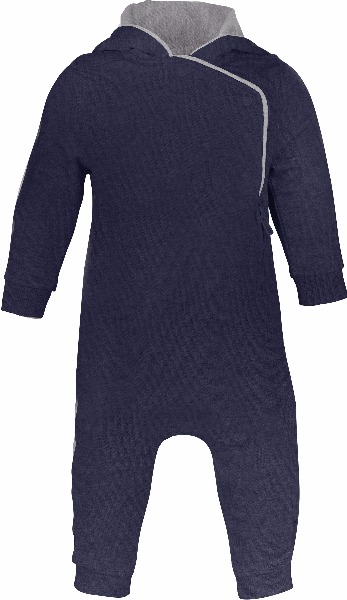 85% coton 15% viscose pour tissu Oxford Grey, 100% coton pour tissu Navy. Molleton non gratt‚. Ouverture sur le devant avec zip et boutons pression. Int‚rieur de capuche contrast‚. Bas de manches et de jambes en bord-c“te.