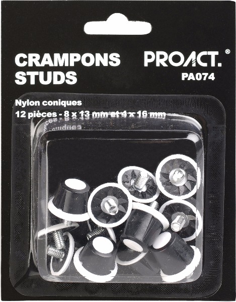 Boite de crampons MIXTEs anylon conique pour la pratique du football sur terrain gras. Livrés sous blister.