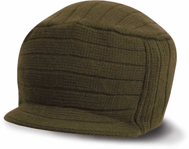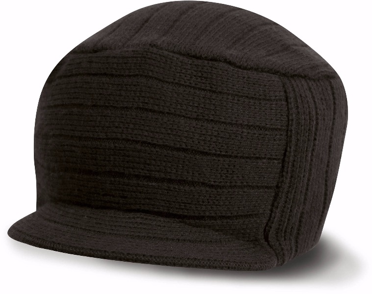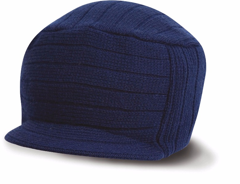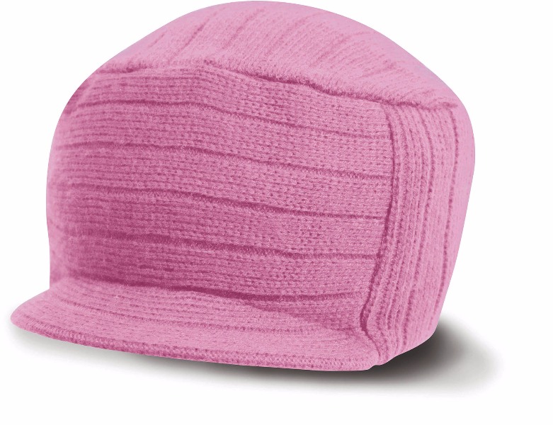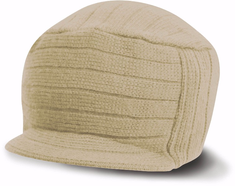 100% poly-acrylique. Large bord tricoté et double épaisseur. Bonnet avec courte visière arrondie.