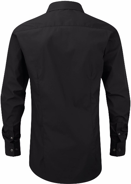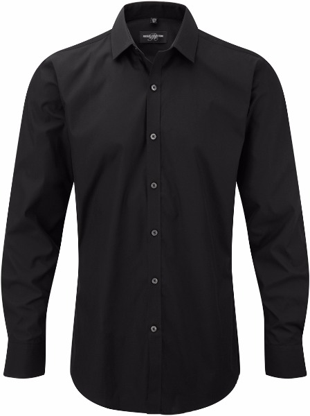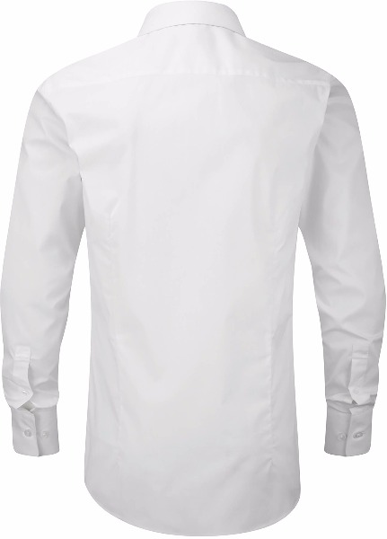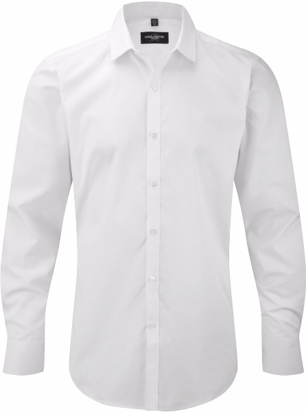 75% coton / 25% élastomultiester (fibre Lycra® T400). Cette nouvelle fibre apporte confort, élasticité, tenue durable et gestion de l'humidité. Col semi-évasé et rabat court. Patte de boutonnage étroite. Pinces au dos. Manchettes carrées avec option boutons de manchette. Coupe ajustée.