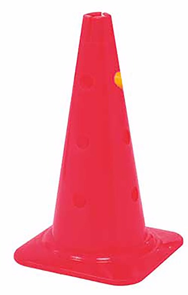 Cône à 12 trous pour jalons. Base carrée semi souple avec encoche sur le haut permettant de positionner un cerceau plat. Hauteur 40 cm.