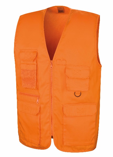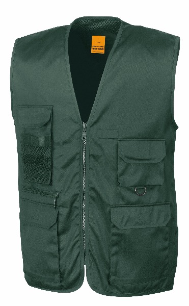 65% polyester / 35% coton sergé épais. Doublure 100% polyester en maille filet dans la moitié supérieure du dos. Fermeture zippée. 2 poches intérieures, poche poitrine droite à soufflet, grandes poches avant basses avec fermeture auto-agrippante. Poche avant cachée, grande poche dans le dos et range stylo/bouchon de pêche sur la poitrine à gauche. Anneau en D. Patte de suspension cousue à l'intérieur du col.