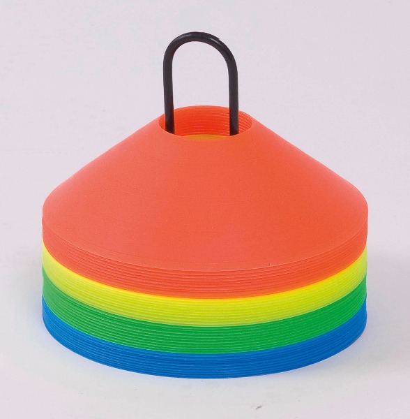 Kit de délimitation conique avec support de transport. Jeu de 40 cônes (10 pièces x 4 coloris différents) de 5 cm de hauteur.