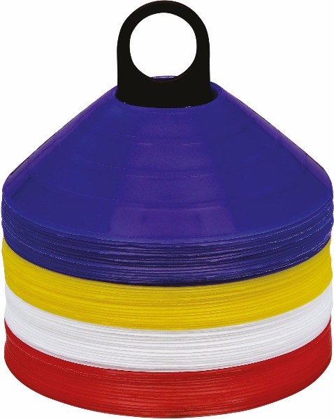 100% polyéthylène basse densité. Kit de délimitation conique avec support de transport. Jeu de 60 coupelles (15 pièces x 4 coloris différents) de 5 cm de hauteur. Bonne visibilité pour les entrainements en intérieur ou sur gazon.