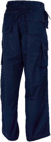 65% polyester / 35% canvas de coton. Enduit de protection anti-taches avec DuPont™ Teflon® fabric protector. Poches intérieures pour genouillères. Poche triple surpiqûre et coutures intérieures pour plus de résistance. Poche pour téléphone sous la ceinture. Grandes poches latérales, avec plusieurs compartiments. 2 poches fonctionnelles à l'arrière : 1 ouverte et 1 avec rabat. Fermeture zippée YKK®. Fond renforcé, idéal pour le travail manuel. Taille max des genouillères : 21 cm x 15 cm. Lavage en machine à 60°C et séchage au sèche-linge. Longueur du pantalon pour toutes les tailles: 81 cm.
