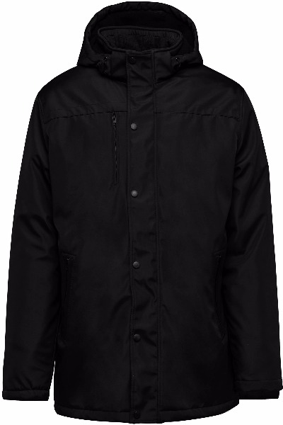 Extérieur : 100% polyester pongé 230g/m². Garniture intérieure 100% polyester 135g/m². Intérieur bi-matière: micropolaire 180g/m² sur haut de corps et doublure polyester 210T 60g/m² matelassée sur bas de vêtement. Tissu extérieur satiné. 2 poches côté et 1 poche poitrine zippées à l'avant. 2 poches intérieures. Intérieur col en bord-côte et capuche amovible doublée polaire. Fermeture zippée avec double curseur et rabat. Bas de manche avec poignets intérieurs en bord-côte. Bande intérieure fantaisie bicolore. 1 zip côté cœur et 1 zip au bas du vêtement pour accès personnalisation.