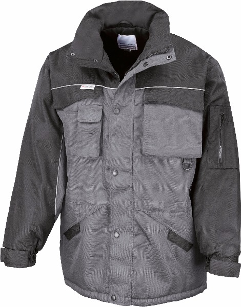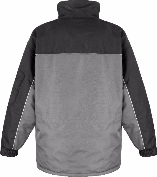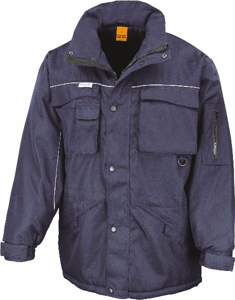 Extérieur : Nylon Taslon Oxford 600D avec enduction PVC. Intérieur : 100% fibre polyester 160g. Doublure : Polaire le long du corps, nylon taffetas 190T en bas. Traitement waterproof et anti-froid. Tissu Azo Free. Coutures renforcées, poches à rabat avec points de renfort. 2 grandes poches plaquées, 2 poches poitrine dont 3 porte stylos, 1 poche extérieure téléphone, 2 poches intérieures et 1 poche porte CD. Passage pour fils écouteurs. Cordon de serrage à la taille avec stoppeurs. Poignets élastiqués réglables. Panneaux réfléchissants 3M. Accès broderie et sérigraphie par zip poche poitrine et bas intérieur.