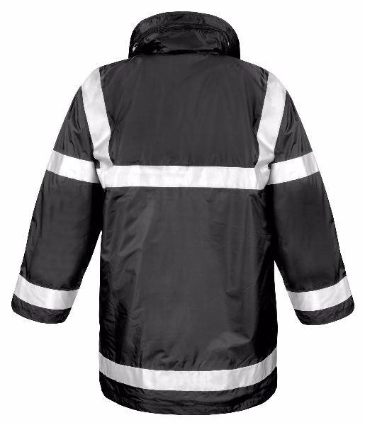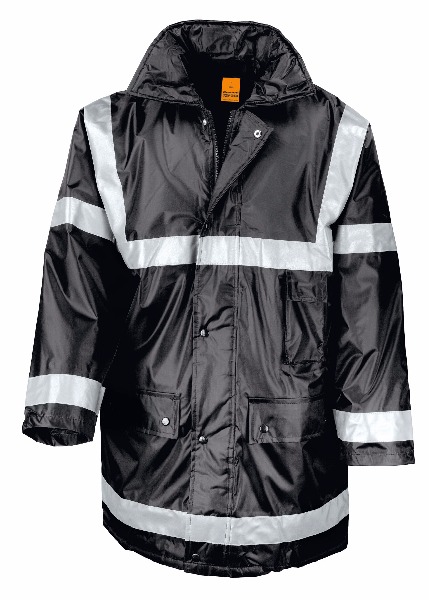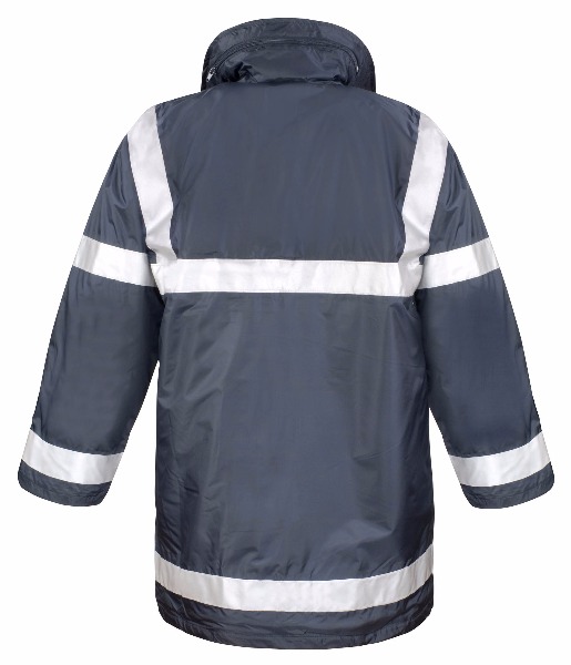 Polyester enduit lourd. Imperméable 1600mm et coutures thermosoudées. Capuche dans col. Doublure matelassée. Bandes 3M réflectorisantes. 2 poches devant avec pression, 1 poche téléphone extérieure et 1 poche intérieure. Ouverture dos pour marquage.