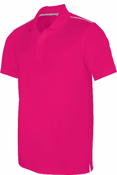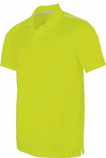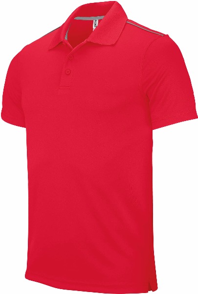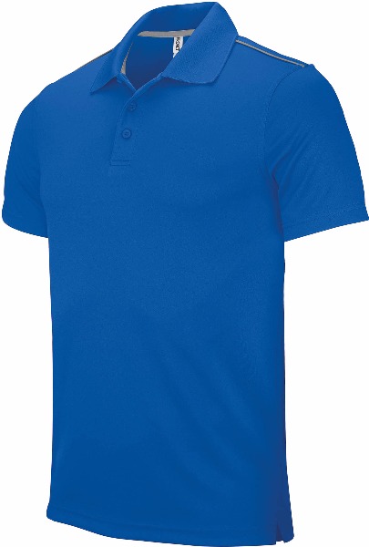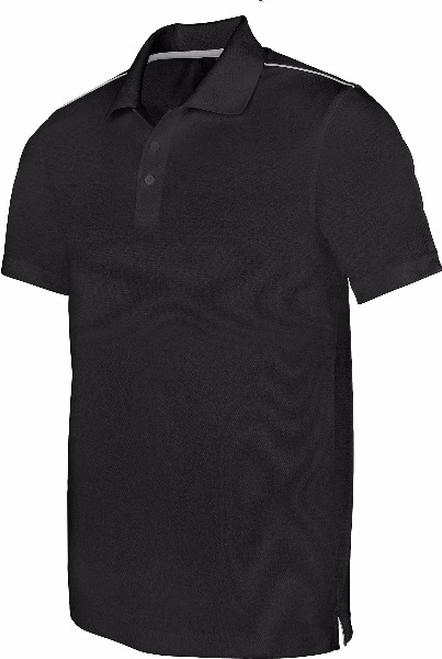 100% polyester interlock. Tissu à séchage rapide. Col en bord-côte. Patte de boutonnage 3 boutons. Bande de propreté contrastée encolure et fentes côtés. Passepoil contrasté épaules. Finition double aiguille bas de manches et bas de vêtement.