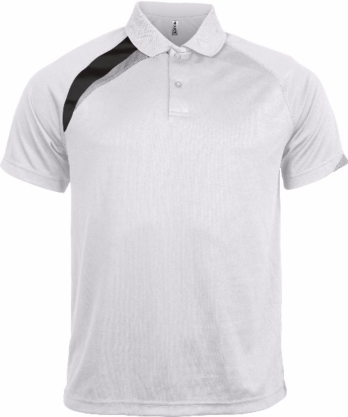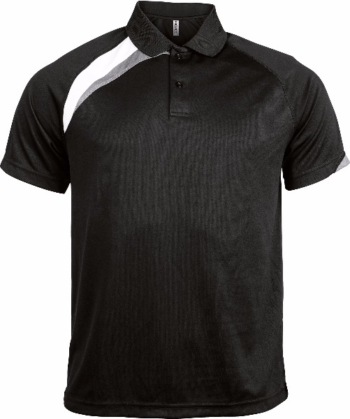 100% polyester. Tissu à séchage rapide. Empiècements contrastés. Col bord-côte 1x1 et 2 boutons ton sur ton. Finition points de recouvrement sur les découpes et double aiguille au bas de vêtement et manches.