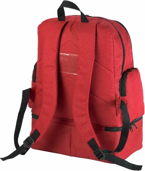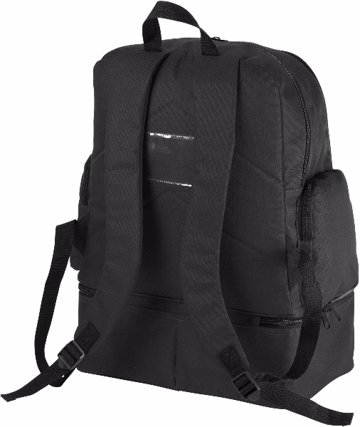 Sac à dos de sport en polyester 600D, double enduction PVC. Base rigide détachable en PP avec pieds en plastique. Poche devant zippée pour faciliter la personnalisation, 2 poches coté, porte carte. Base rigide livrée avec sac à dos.