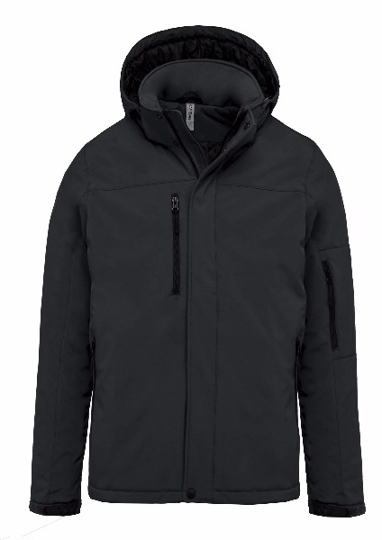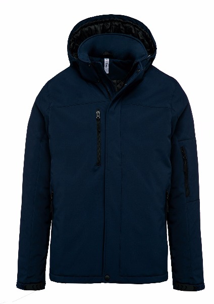 95% polyester / 5% élasthanne. Tissu contrecollé 3 couches respirant 3000 g/m²/24h et imperméable 8000 mm. Extérieur : 95% polyester / 5% élasthanne. Intermédiaire : membrane respirante. Couche intérieure : micropolaire. Doublure matelassée 100% polyester. Devant : 4 poches zippées (2 latérales, 1 sur la manche, 1 poitrine côté droit). 2 poches intérieures avec bouton pression. Capuche amovible 3 panneaux doublée et matelassée, réglable avec stoppeurs. Bas de manche réglable avec bande auto-agrippante. 1 zip côté cœur et 1 zip au bas du vêtement pour accès personnalisation.