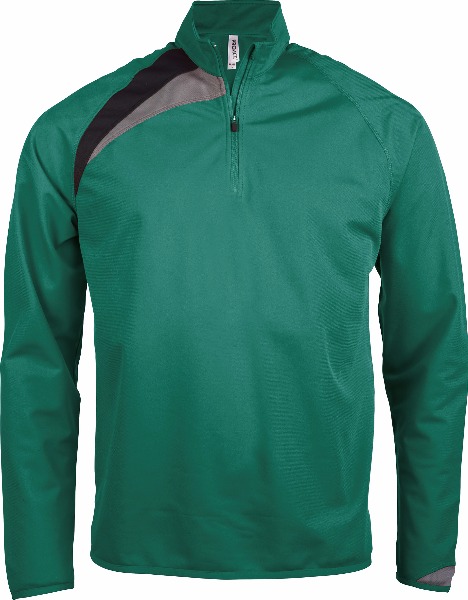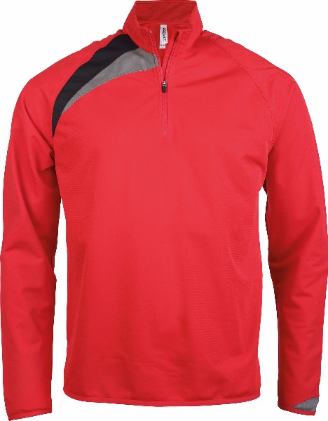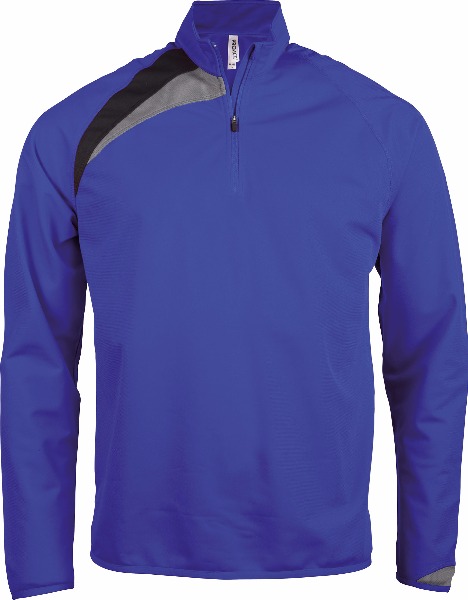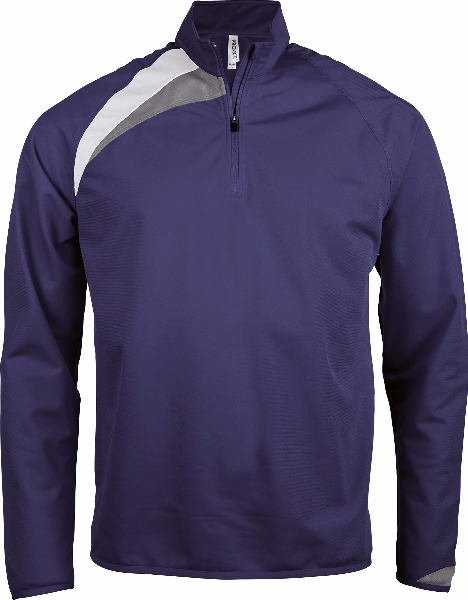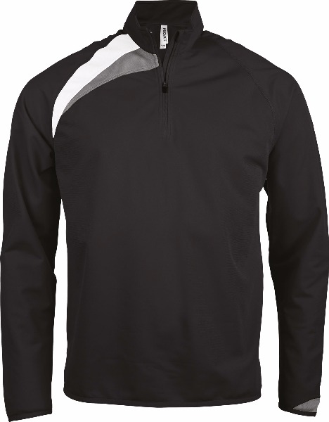 100% polyester polytricot gratté. 1/4 zip. Empiècements contrastés corps et bas de manche. Coutures en points de recouvrement ton sur ton. Bas de vêtement et manches avec bande élastique.