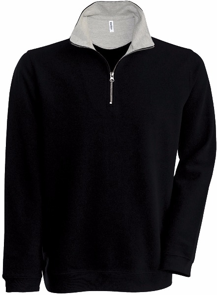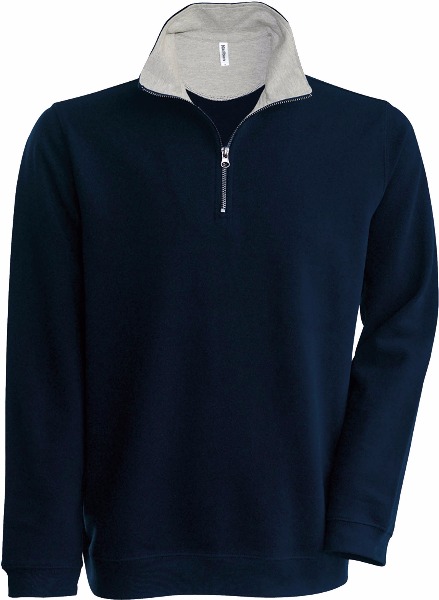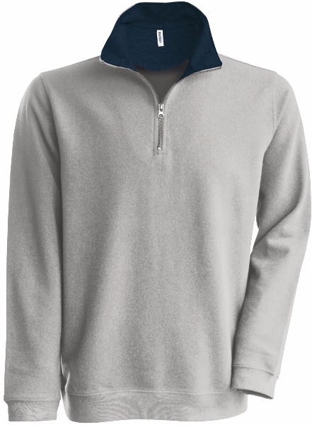 80% coton / 20% polyester. Maille piquée. Col zippé. Intérieur col et parementure contrastés. Bord-côte 1x1 au bas des manches et au bas du vêtement.