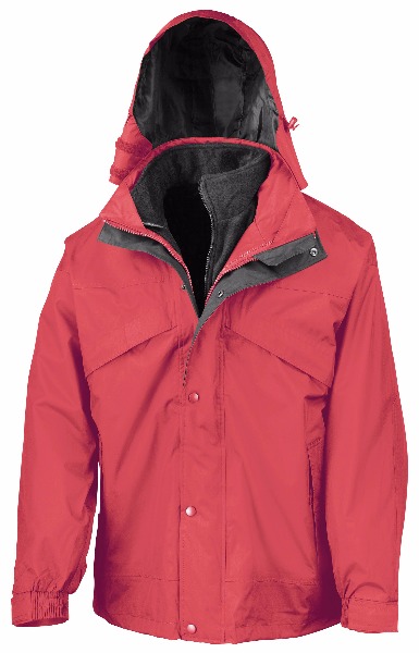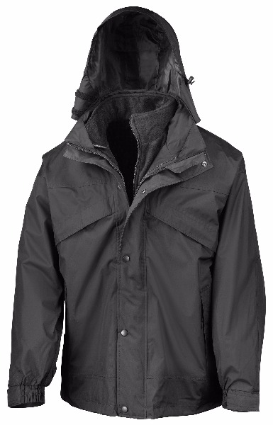 Veste extérieure : Corps : 100% polyester pongé 200g avec enduction PVC imperméable. Doublure : haut du corps en maille polyester et bas du corps et manches en taffetas nylon 190T. Col montant zippé avec ajustement par cordon de serrage. Capuche cachée totalement décorée avec garde menton à fermeture auto-agrippante et ajustée par corde de serrage. Entièrement imperméable avec coutures renforcées pour résister jusqu'à 160 millibarsde pression. Deux oeillets sous chaque bras. Poignets élastiqués avec patte de fermetureauto-agrippante.Veste détachable zippée : Veste détachable polaire 100% polyester 280g/m². Polaire anti-peluche. Poches latérales profondes.