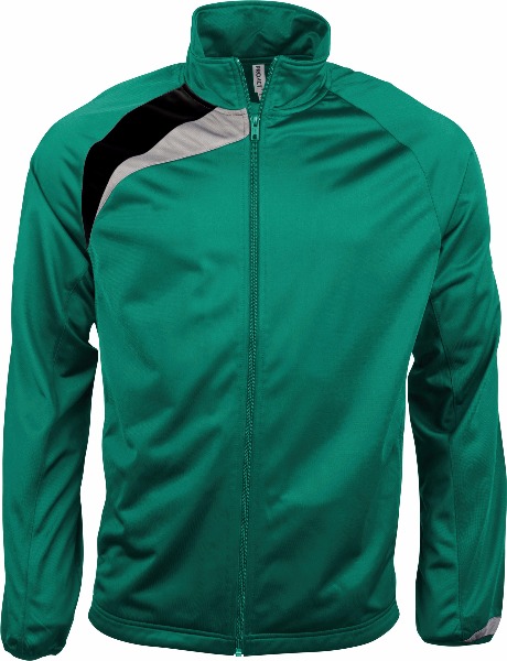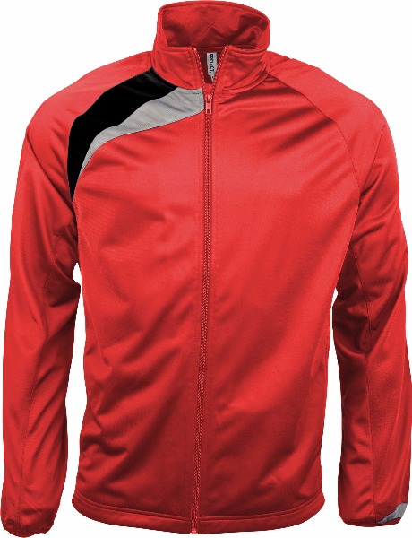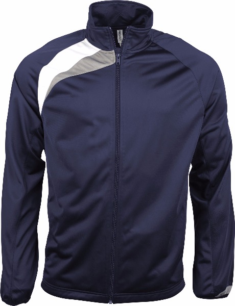 100% polyester polytricot. Fermeture zippée. Empiècements contrastés. 2 poches latérales. Bas de manches avec bande élastique.