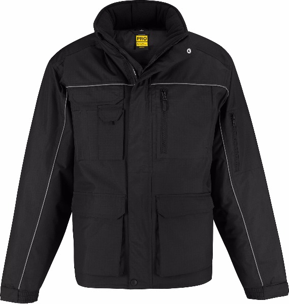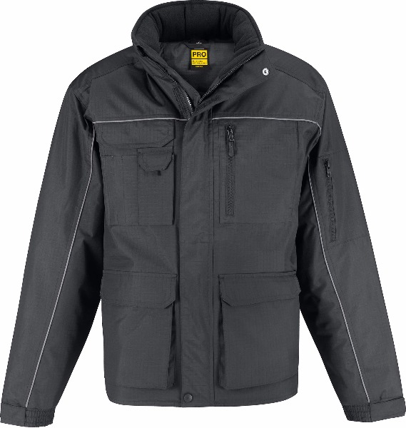 Couche extérieure : 100 % polyester pongée rip-stop imperméable (5000 mm) et coupe-vent. Couche intérieure : doublure 100 % polyester rembourrée 200 g/m2. Dos plus long, col montant doublé micro-polaire avec protège-menton et rabat extérieur anti-intempéries. Passepoil réfléchissant à l'avant et à l'arrière. Capuche ergonomique doublée intégrée dans le col avec cordon élastique et 2 stoppers. Poignets ajustables. Coutures à double surpiqûre sur les épaules, les emmanchures et les poches au niveau de la taille, avec brides d'arrêt. 12 poches multifonctions (plusieurs poches larges avec rabat de protection, poche poitrine extérieure zippée, poche extérieure pour smartphone, 3 poches stylo et 2 poches à double entrée sur l'avant avec accès latéral aux poches chauffe-mains en polaire et rabat, 1 poche portefeuille plaquée à l'intérieur avec rabat et 1 poche zippée sur la manche). Accès facile pour décoration.