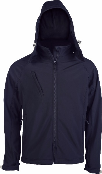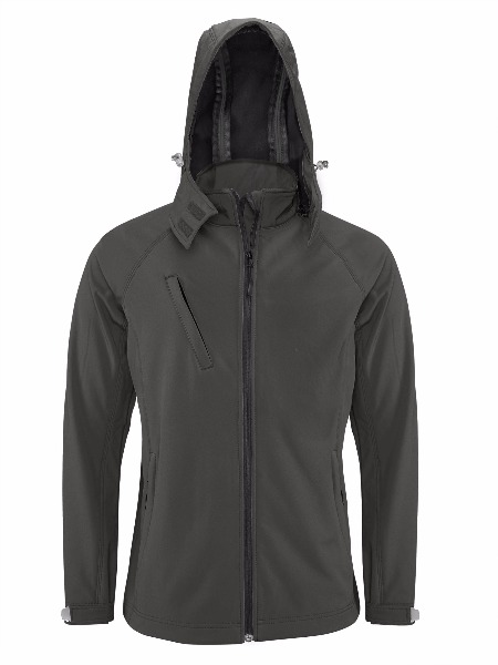 6% élasthanne. Intermédiaire : membrane respirante et micro-aérée. Couche intérieure : micropolaire anti-boulochage. Manches raglan. Fermeture zippée. 2 poches zippées devant. 1 poche zippée poitrine côté droit. Capuche amovible avec cordon de serrage et fermeture auto-agrippante. Patte de serrage auto-agrippante au bas de manches. Zip invisible intérieur côté cœur pour accès personnalisation.