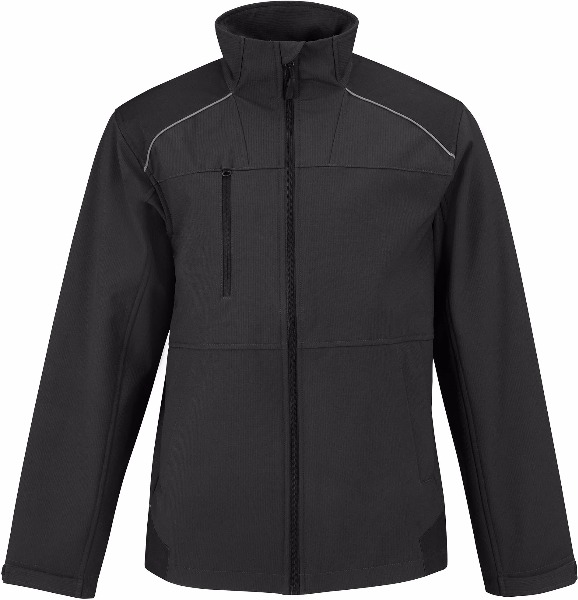 Softshell rip-stop 3 couches. Couche extérieure : mini rip-stop 96 % polyester / 4 % élasthanne. Couche intermédiaire : membrane laminée en polyuréthanne thermoplastique respirante (1000g/m²/24h), coupe-vent et imperméable (2000 mm). Couche intérieure : micro-polaire 100 % polyester. Dos plus long, col montant, patte intérieure anti-intempéries et protège-menton. Passepoil réfléchissant sur les épaules et en bas du dos. Pièces de renforcement noires en nylon Oxford sur les épaules, les coudes et le bord inférieur à l'arrière. Coutures à double surpiqûre et zip SBS. Manches articulées et poignets ajustables. 2 poches avant zippées avec rabat, 1 poche poitrine zippée à droite, 2 poches intérieures. Bord inférieur ajustable à l'aide de cordons et de stoppers. Accès facile pour la décoration (avant - arrière - manches).
